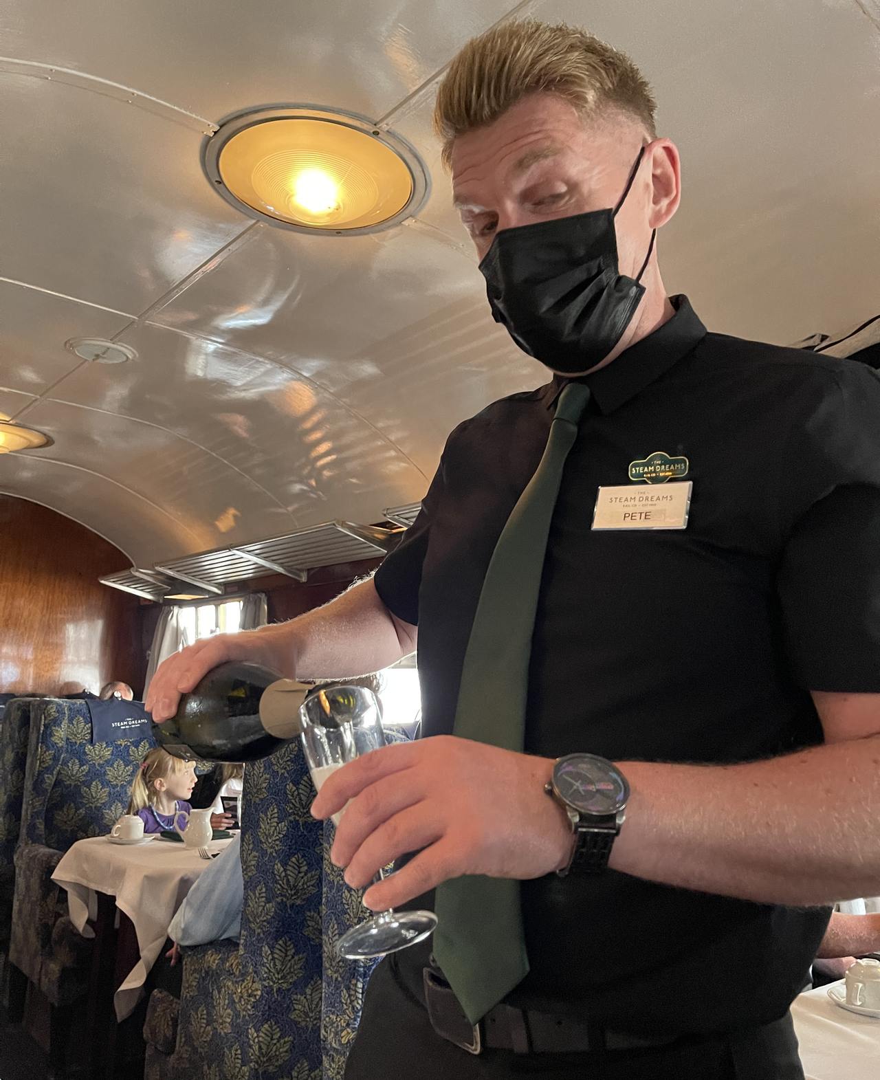 Then the whistled blew and we were off. As we chugged out of Victoria, champagne was served by Peter, donning a black uniform and a wide smile (no doubt) beneath a black mask. Then orange juice and coffee.